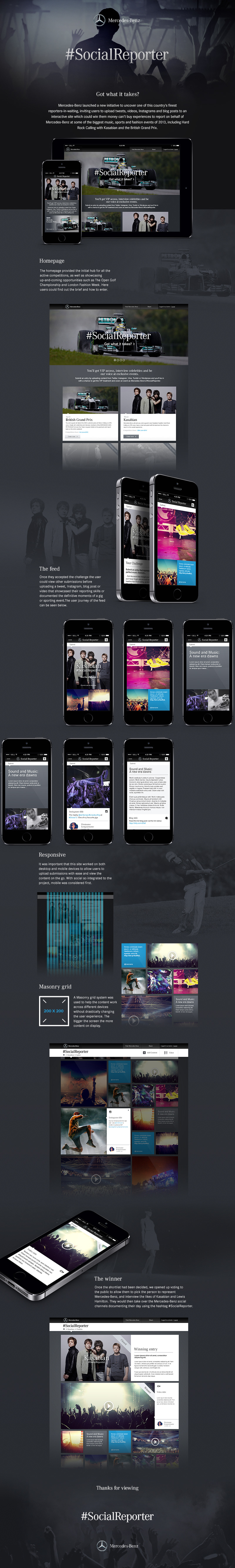 Social Reporter. Mercedes-Benz "most collaborative" campaign, inviting users to upload tweets, videos, Instagrams and blog posts to an interactive site which could win them exclusive access to music, sports and fashion events.
