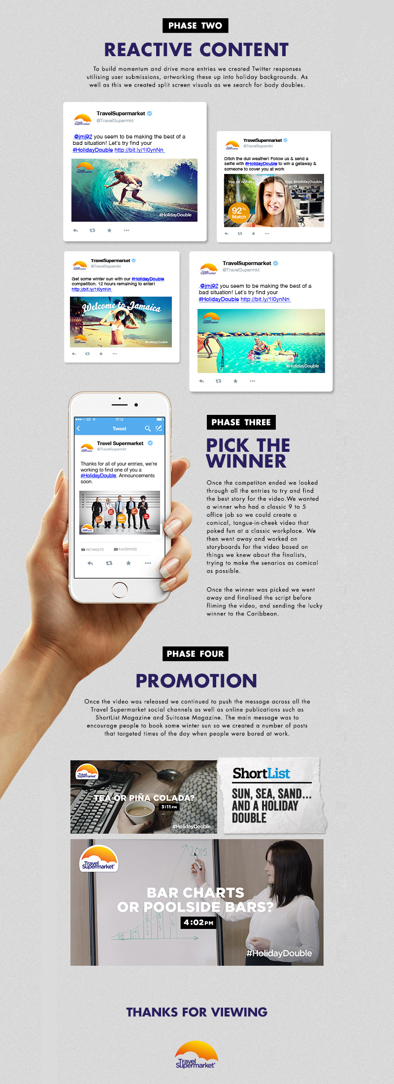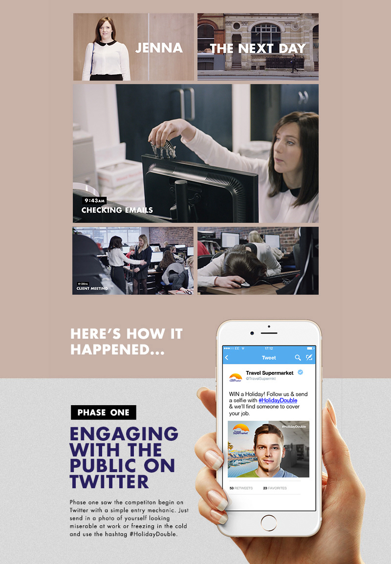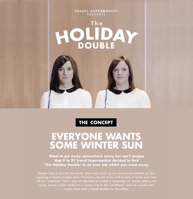 Art Direction and conceptual work for Travel Supermarkets Holiday Double. Want to get away somewhere sunny but can’t escape that 9 to 5? Travel Supermarket decided to find 'The Holiday Double’ to do your job whilst you went away.
